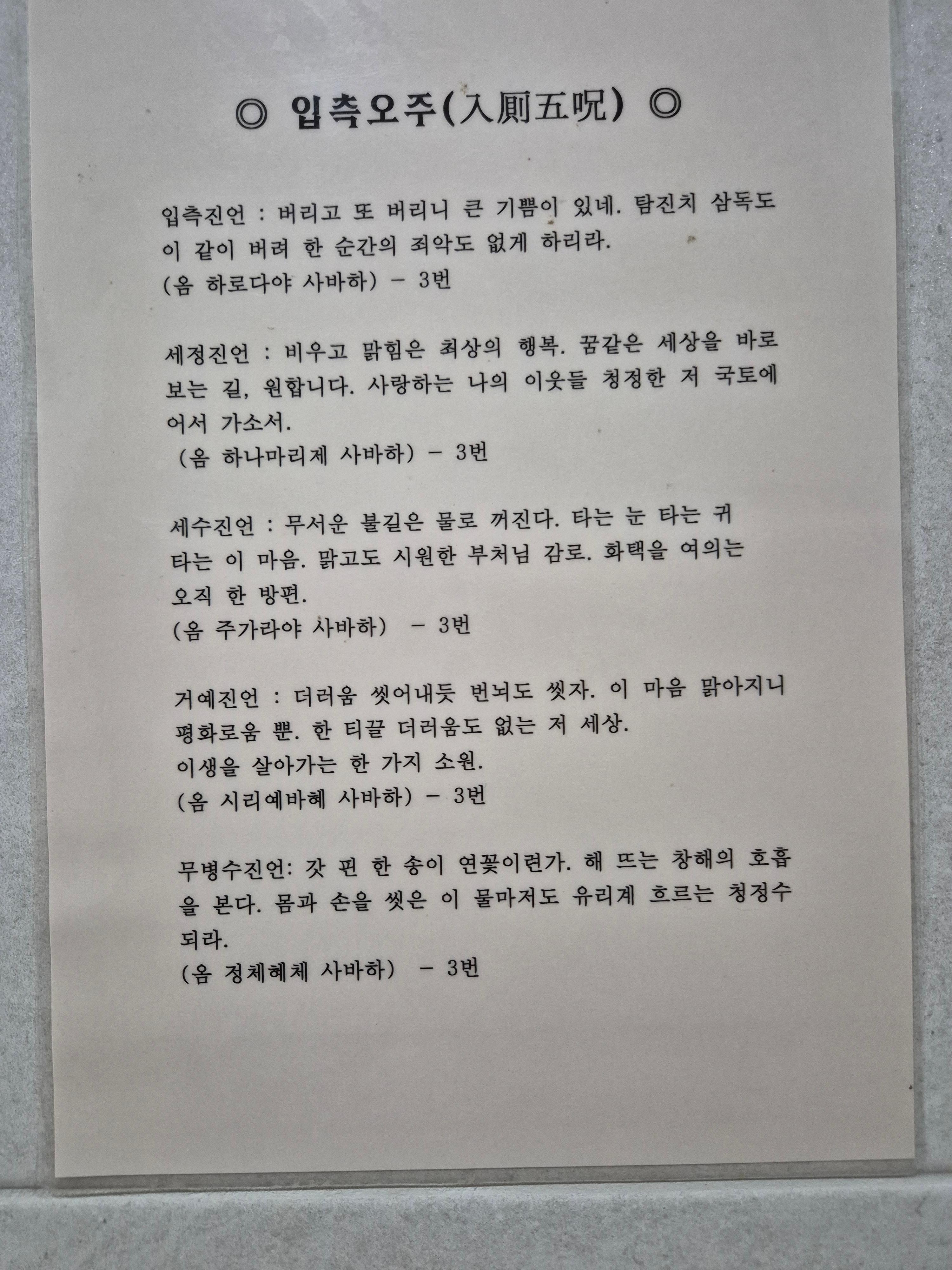 그래도 화장실의 벽면에 붙어있는 입측오주의 진언으로 더러움을 씻고가자. 옴 정체혜체 사바하!
