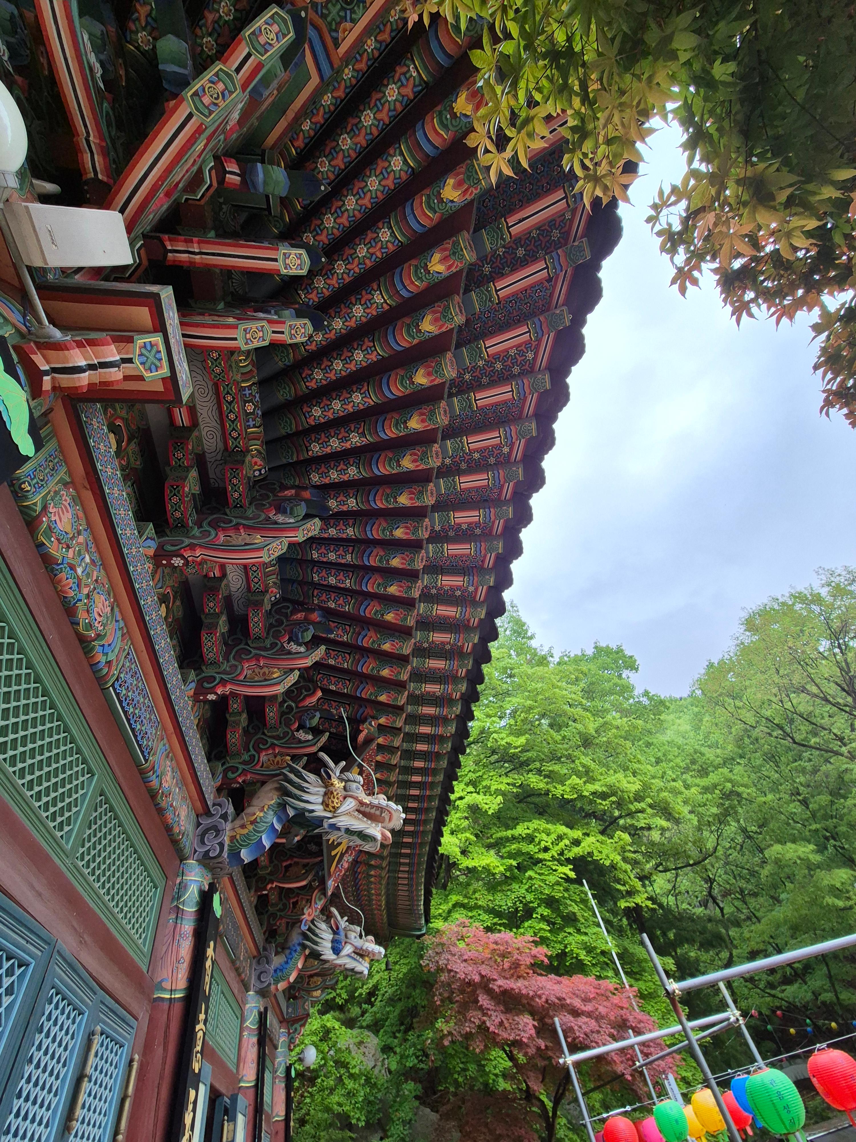 참배를 하고 나오면서 문득 화려한 대웅전 처마에 시선이 머물자 아! 용의 위엄으로 공포를 조성한 특이한 조형미가 인상적이다