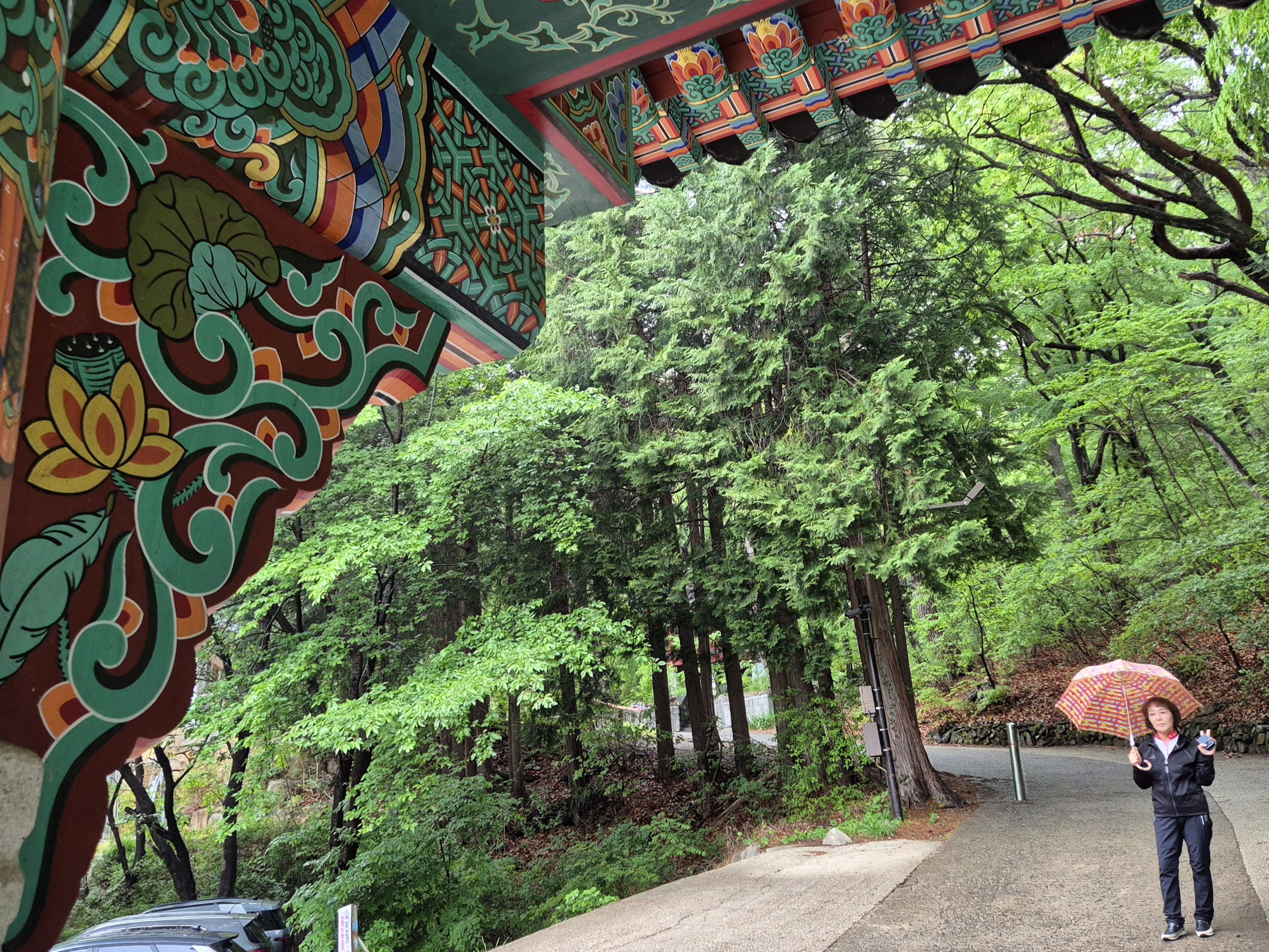 비오는 길을 달려온 천성산 홍룡사에서 아내는 지금 50년 전 20대의 소녀같이 천진한 모습으로 행복한 표정이다.